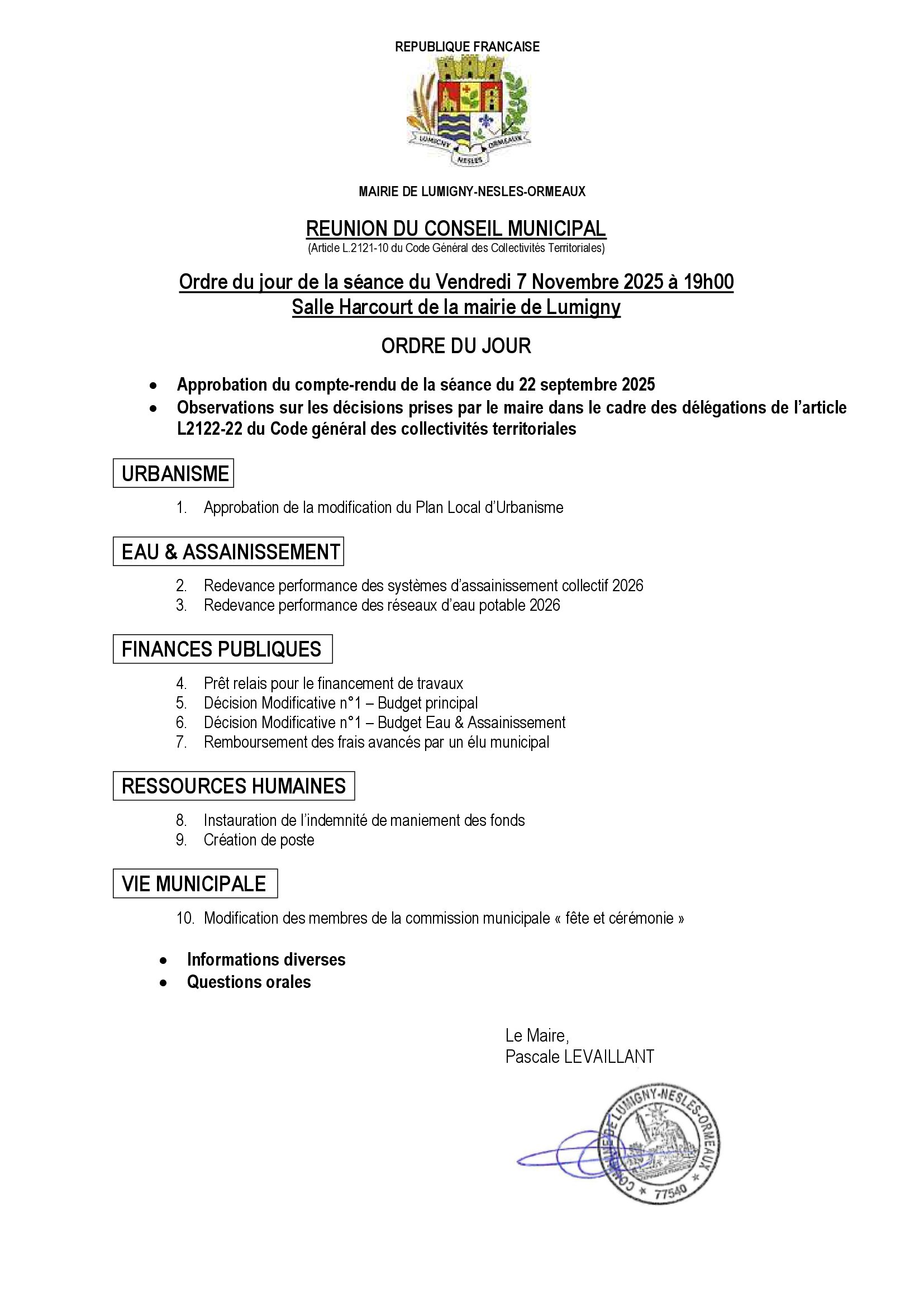 Le prochain Conseil Municipal de Lumigny se tiendra le vendredi 7 novembre 2025 à 19h, à la mairie de Lumigny