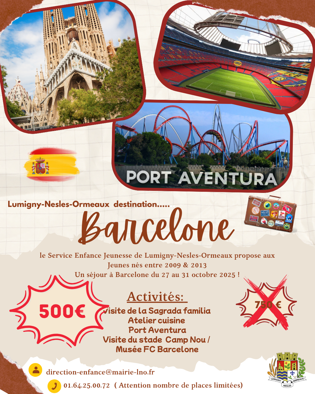 Le Service Enfance Jeunesse de Lumigny-Nesles-Ormeaux organise un séjour inoubliable à Barcelone du 27 au 31 octobre 2025 pour les jeunes nés entre 2009 et 2013 !