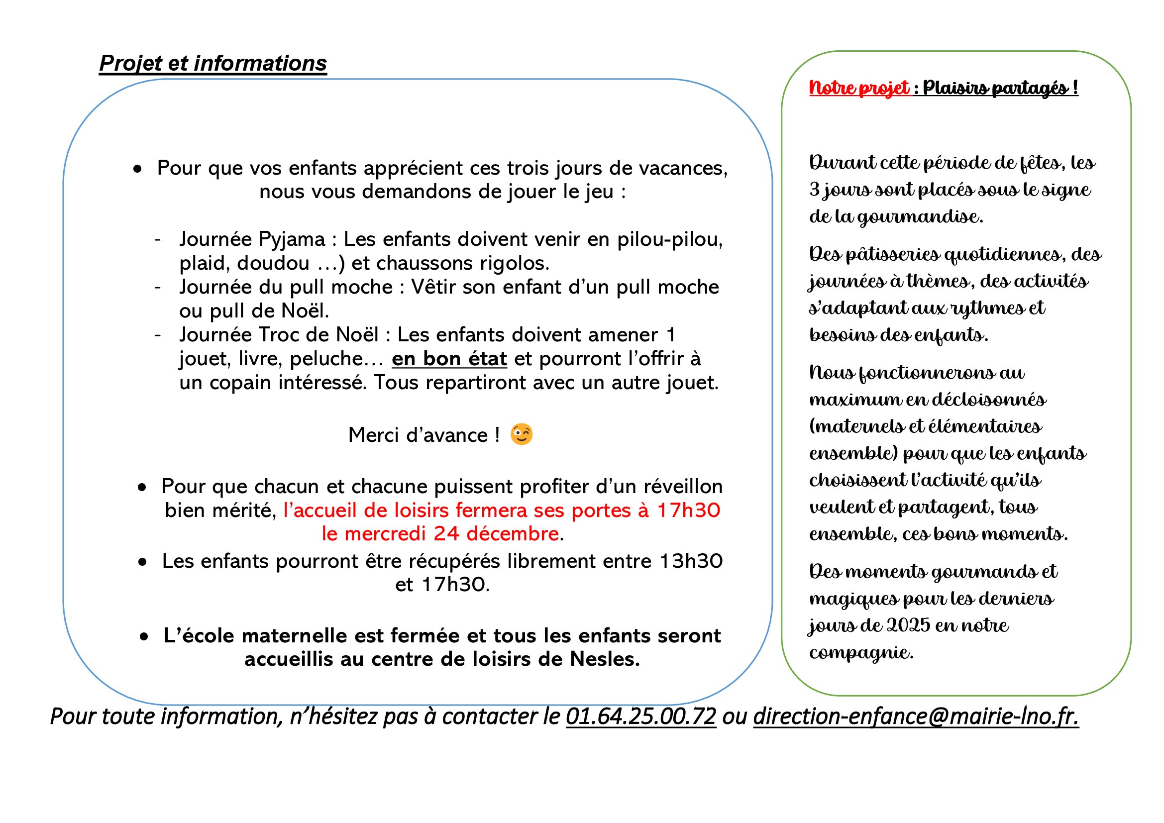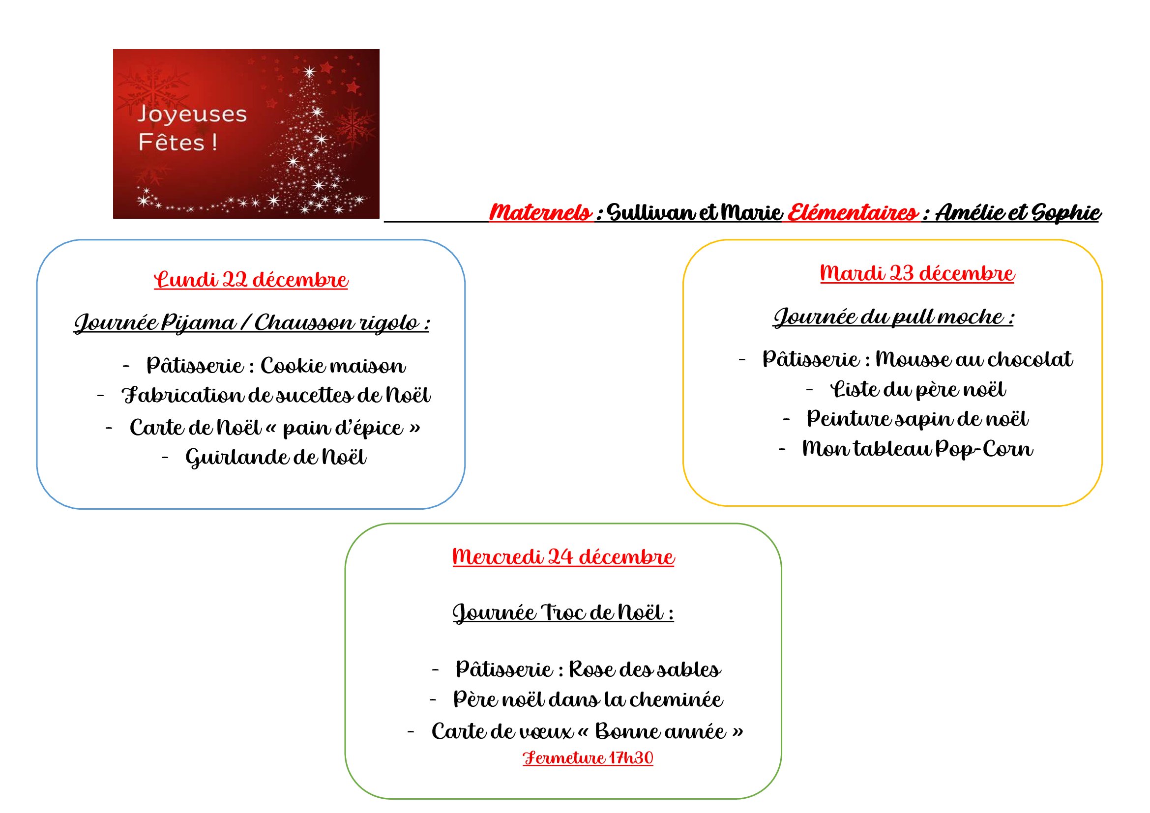 Planning des activités du centre de loisirs des vacances de Noel 2025