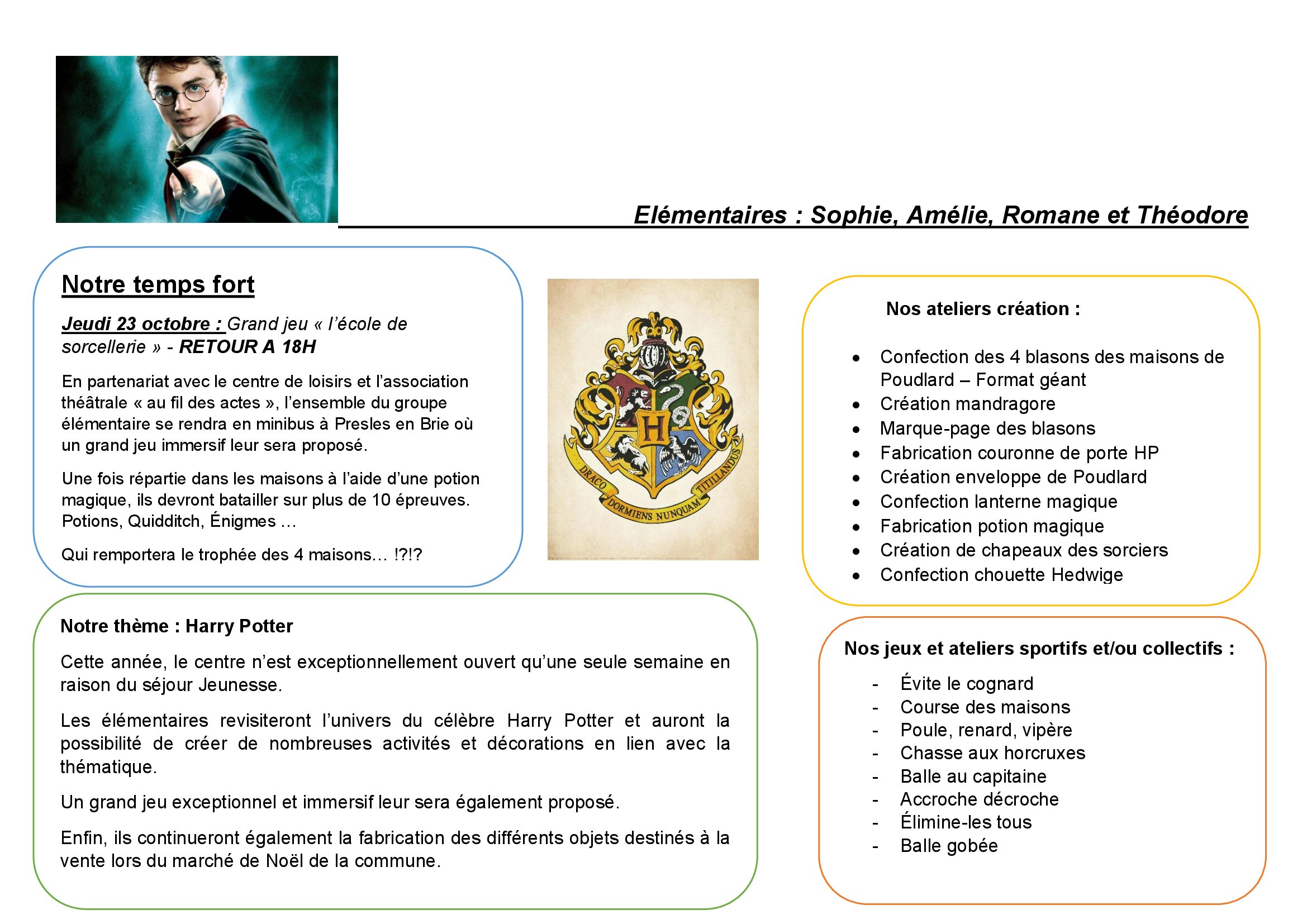Planning des activités des mercredis de septembre octobre 2025