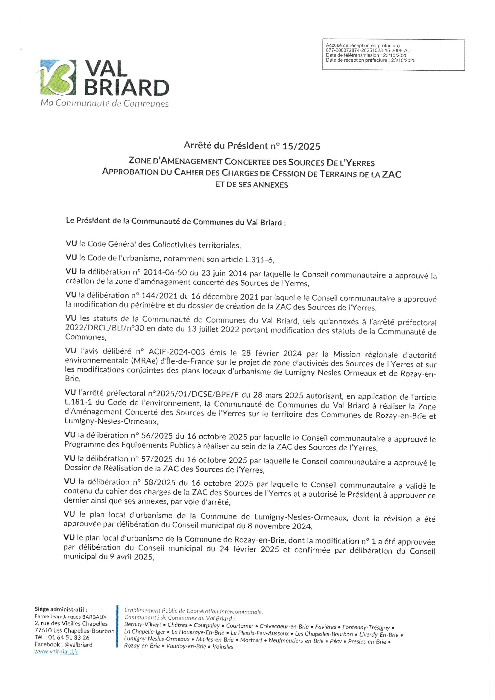 ????️ Par arrêté n°15/2025 du 23 octobre 2025 par le Président de la Communauté de Communes du Val Briard,